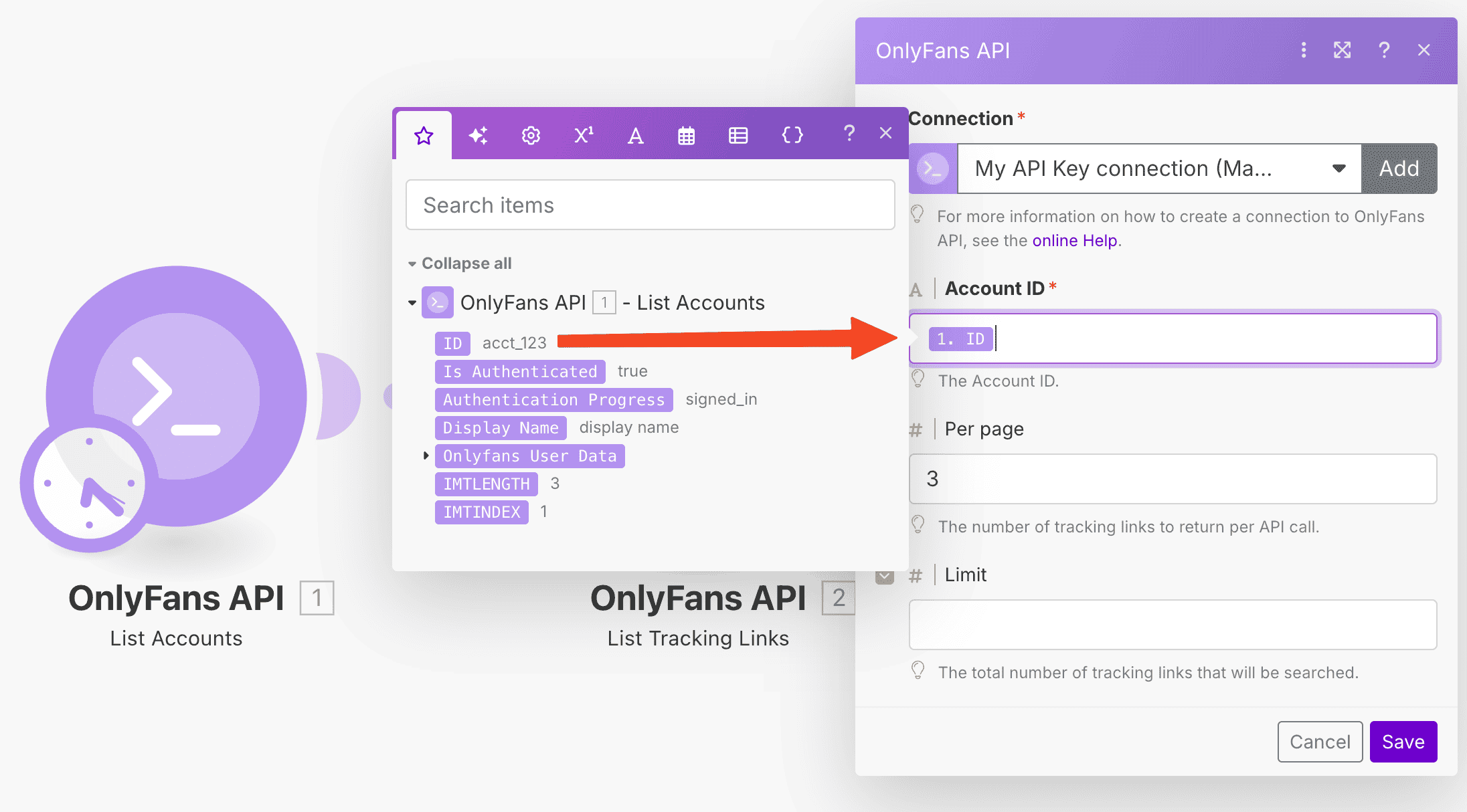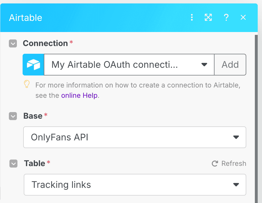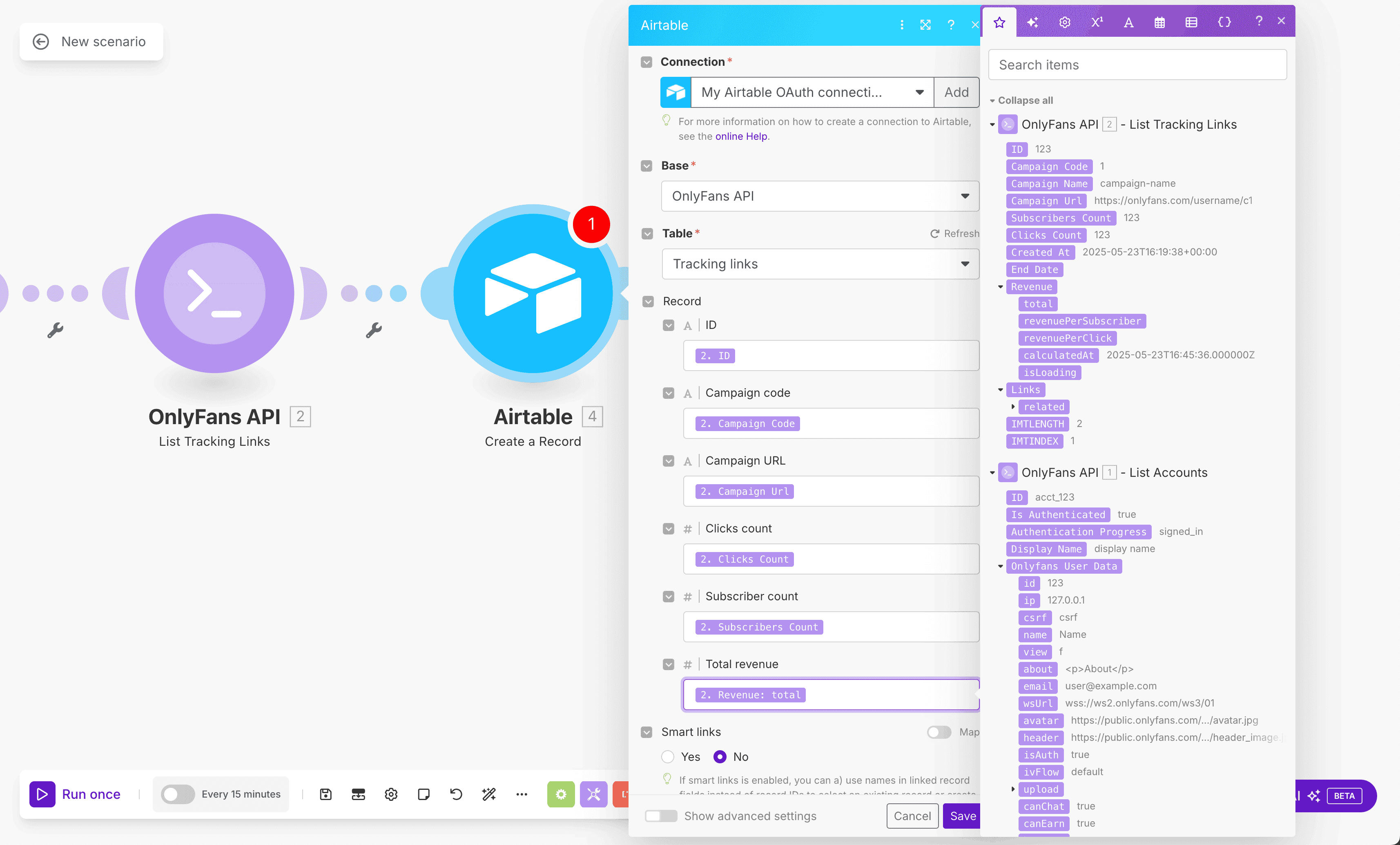 For this example, we'll create a scenario that periodically retrieves the tracking link data from all of your connected OnlyFans accounts, and saves the data to Airtable.