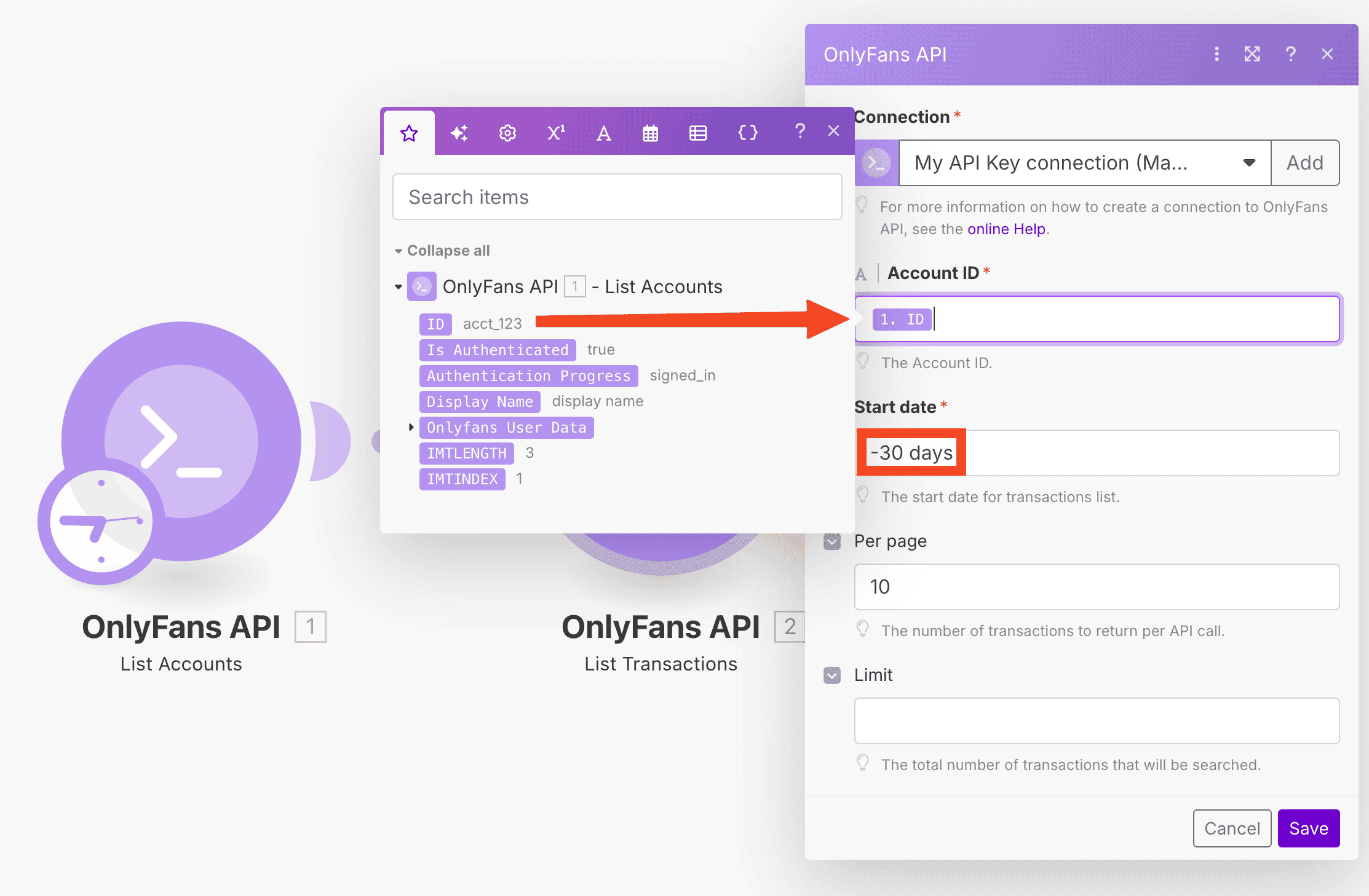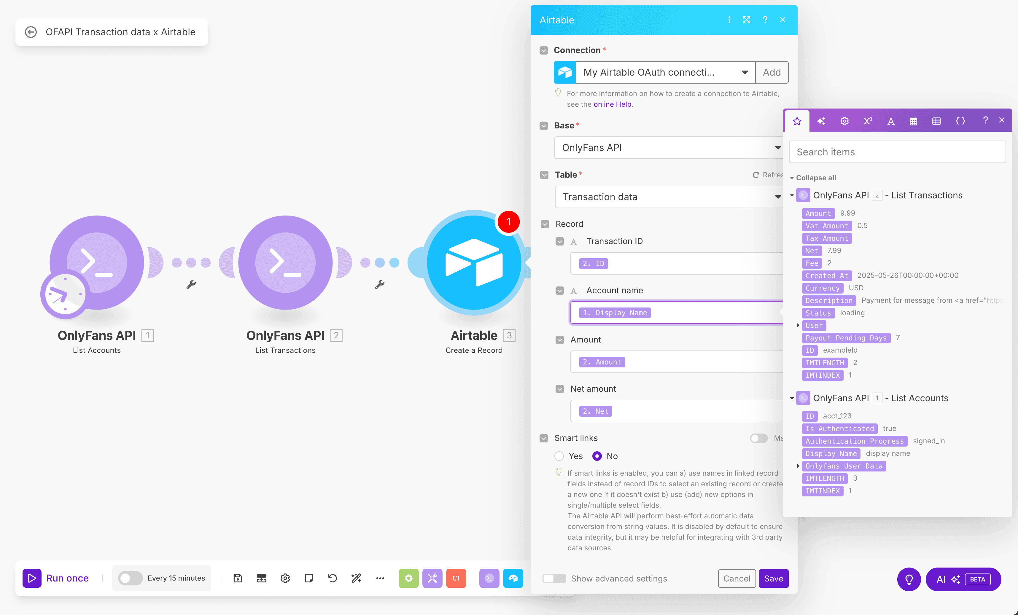 For this example, we'll create a scenario that periodically retrieves the transaction data from all of your connected OnlyFans accounts, and saves the data to Airtable.